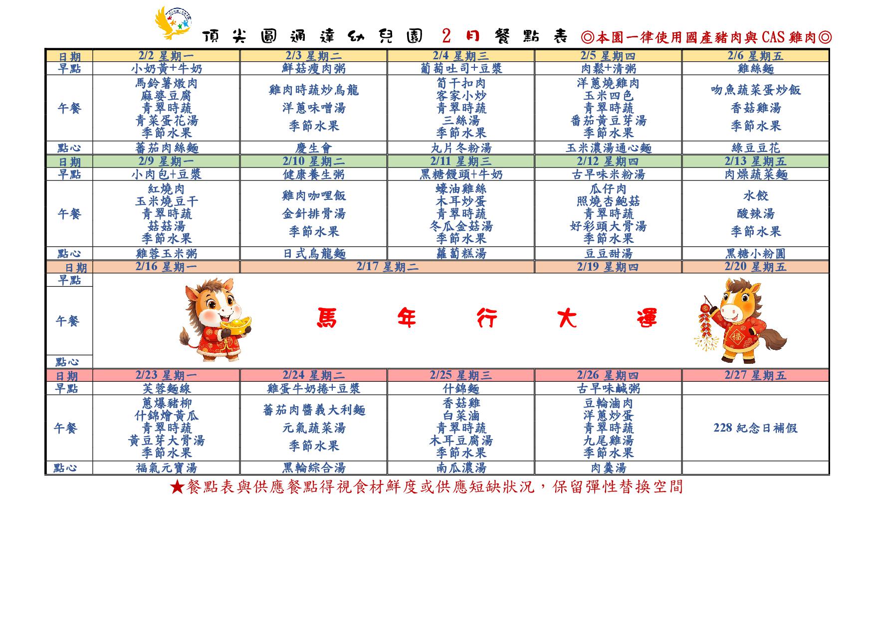 頂尖圓通達幼兒園2月餐點表